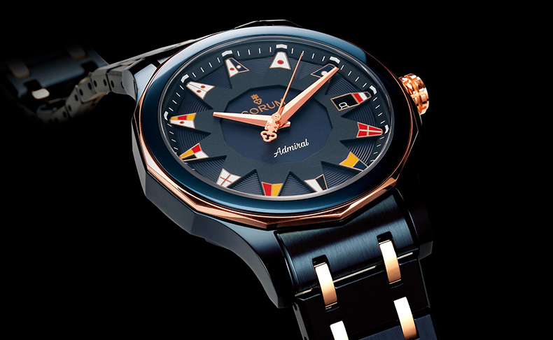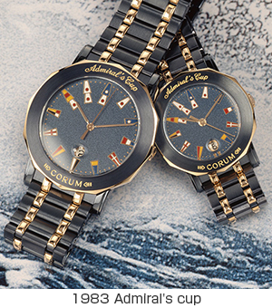 コルムが最初にアドミラルコレクションを発表したのは1960年。スクエア型防水ウォッチとして誕生したアドミラルは、1983年に大胆な変貌を遂げます。ヨット用のナットから着想を得た12角型ベゼル、航海ペナントをそのまま使用したカラフルなインデックスなど、マリンスポーツの世界観溢れるデザインを纏うようになりました。また、海を想起させるメタリックなブルーの色合いの“ガンブルー”と呼ばれたカラーリングは当時でも先進的でした。