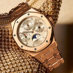 2024年始めに発売された「ロイヤル オーク フライングトゥールビヨン オープンワーク」に初めて使われたこの新しい素材サンドゴールドは砂丘からイメージした名称で、金、銅、パラジウムの合金で構成され、暖かみを感じさせる色味が特徴です。