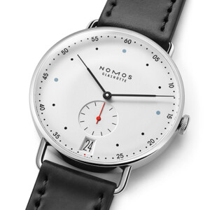 テトラはノモス グラスヒュッテのスクエアウォッチモデルです。この独立したウォッチメーカーが1992年に発表した最初のコレクションの一つであり、またカラフルなダイアルを備えたノモスのモデルの一つでもあります。ダブルステップラグを備えるステンレススチール製のケースは、洗練された色の構成に最適な舞台です。
