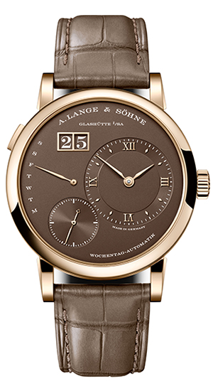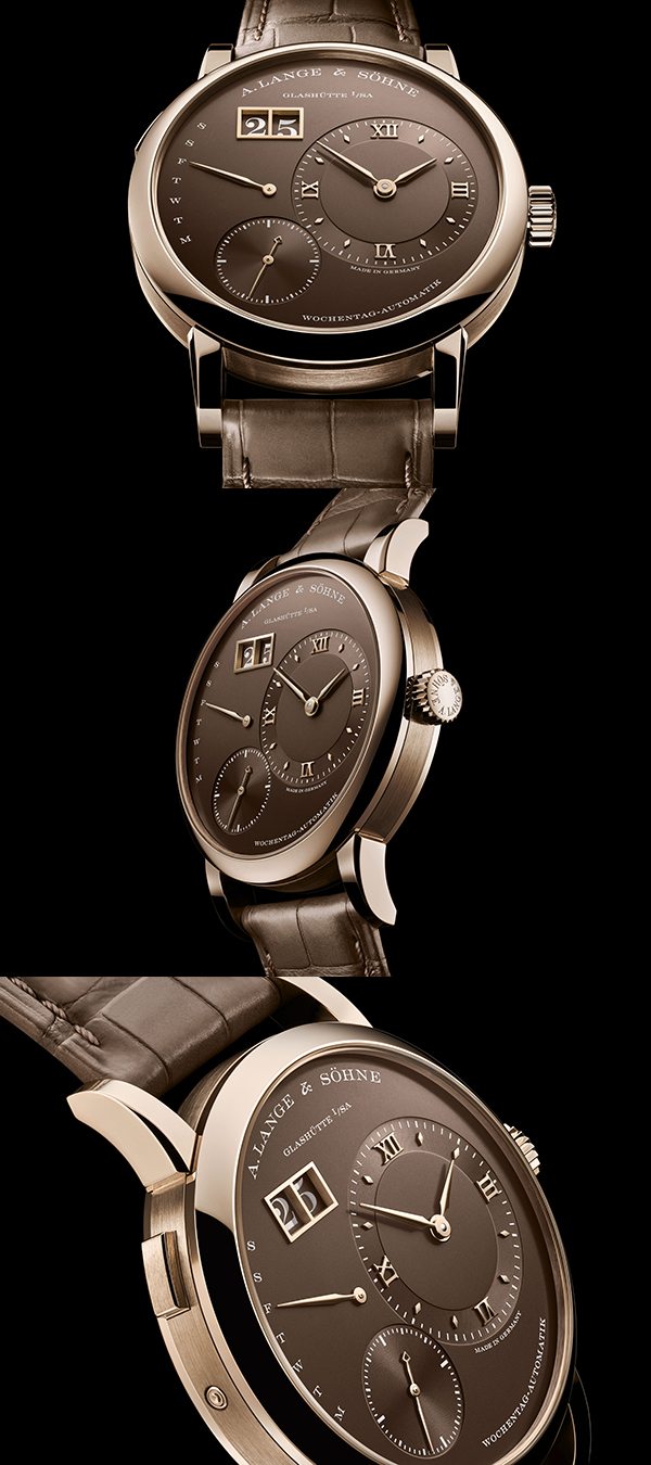 仕様:時・分表示、ストップセコンド機能を搭載した秒表示のサブダイヤル、ランゲ独自のアウトサイズデイト、レトログラード式曜日表示 シルバー925製ブラウンダイヤル、シースルーケースバック