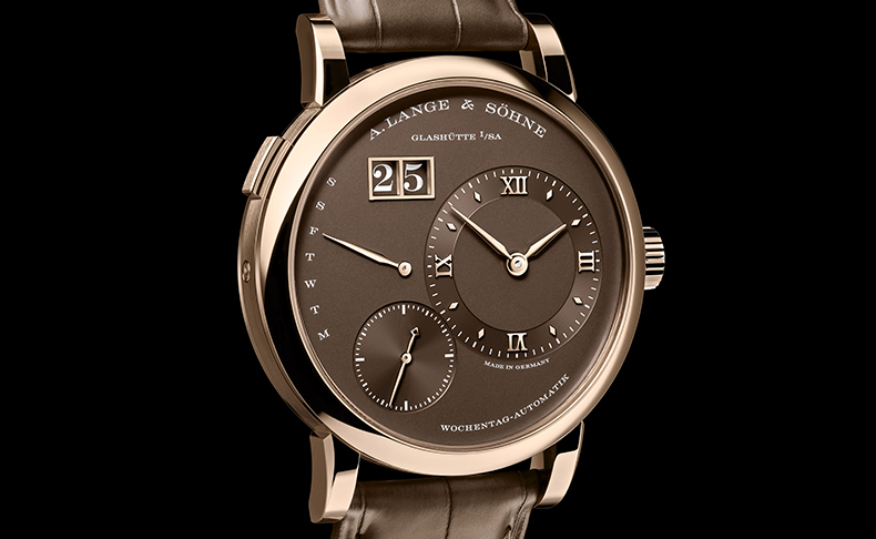2010年に発表されたランゲ1・デイマティックは、紛れもなくランゲ1でありながらも、数々の賞に輝いた特徴的なスタイルを持つランゲ1のデザインに新たな視点をもたらしています。手巻きのランゲ1の特徴であるオフセンターダイヤルはランゲ1・デイマティックでも採用されていますが、そのレイアウトはオリジナルを鏡に映したように反転させたものとなっていて、時分表示がダイヤルの右側、スモールセコンドとアウトサイズデイトが左側になっています。