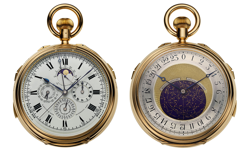 18Kイエローゴールドケースの“グロス ピエス”は、オーデマ ピゲが製作した中で最も包括的な天文時計であり、スカイチャートを搭載した初期の作品のひとつです。ロンドンの夜空を315個の星とともに描き、恒星時、永久カレンダー、ムーンフェイズ、均時差を表示します。20世紀に製作されたオーデマ ピゲ唯一の超複雑懐中時計であり、ミニッツリピーター、グランド&プチソヌリ、クロノグラフ、そしてAPの懐中時計では当時唯一のトゥールビヨンを備えています。