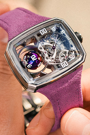 仕様:リニア レトログラード ジャンピングアワー、ミニッツ フライング トゥールビヨン、サテン仕上げとレッドザポンラッカーを施したスケルトンのロジウムプレーティッドベースダイアル、プリントされたミニッツの線とグラボライト®製の分表示が記載されたカラーサファイアクリスタルの中間ダイアル(右側の分表示)、マット仕上げのレッドラッカーと表面にブラックの酸化加工を施したプレートの上部ダイアル(左側の時表示)