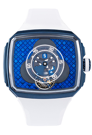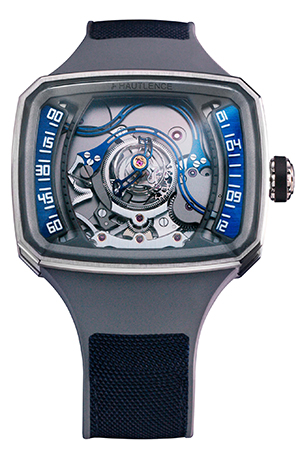 仕様:レトログラードアワーおよびミニッツ、セントラル シリンドリカル トゥールビヨン、サテン仕上げを施したスケルトンのロジウムプレーティッドベースダイアル、グラボライト®製の時分表示およびインデックスが付いたブルーALDコーティングを施したロジウムプレーティッド時分サブダイアル(両サイド)