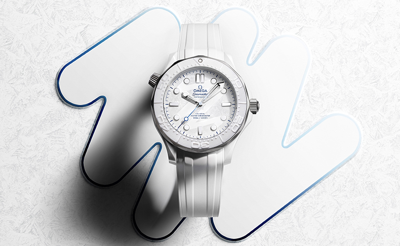 冬のイメージを表現するため、オメガはホワイトセラミックとグレード5チタンを採用しました。この2つの素材は、洗練された美しさ、軽さ、そして強度も兼ね備えています。また、それぞれに多彩な仕上げが施されており、デザイン全体に絶妙なコントラストを生み出しています。ポリッシュとブラッシュ仕上げを組み合わせたケース本体、サンドブラスト仕上げのヘリウムエスケープバルブとリュウズ、そしてホワイトセラミック製ベゼルリングには、レーザー加工によるポジティブレリーフのダイビングスケールがあしらわれています。