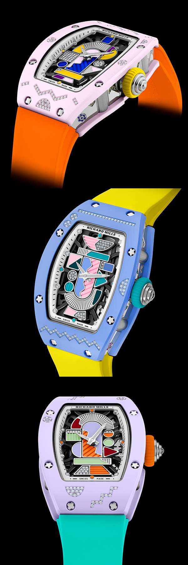 ポリッシュ仕上げが施されたホワイトゴールド製のミドルケースには、サテン仕上げのピラーが配置され、様々な宝石によって美しく輝きを放ちます。RM 07-01 ブラッシュピンクではダイヤモンドに加え、イエローサファイアとブルーサファイアを、RM 07-01 パウダーブルーではダイヤモンドにピンクサファイアとツァボライトを組み合わせています。一方でRM 07-01 ラベンダーピンクは、ダイヤモンドにオレンジサファイアとルビーを組み合わせ、躍動感あるハーモニーを生み出します。