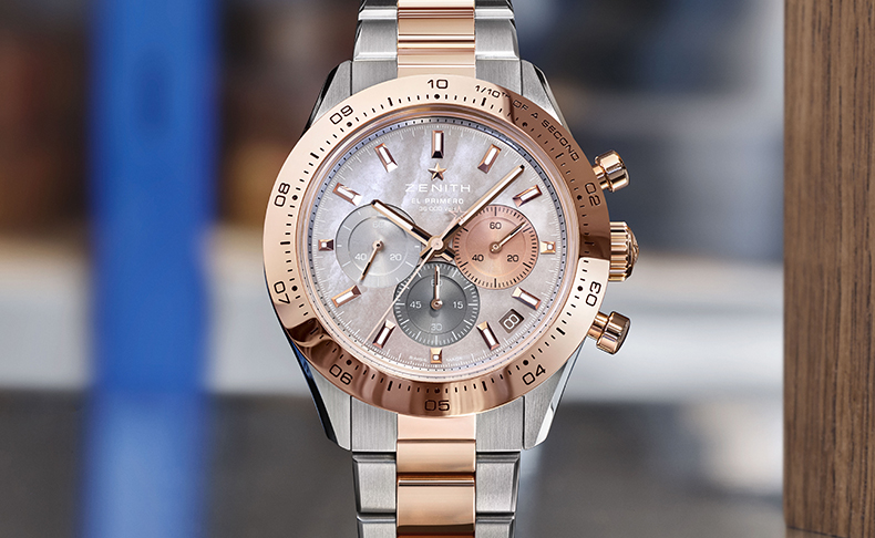 サファイアガラス越しにさりげなく光沢を湛えるマザーオブパールの文字盤は、入念な計算のもと、華美な装飾感が抑えられています。光は文字盤の表面全体を行き来し、時間帯によって印象を少しずつ変化させます。オリジナルのエル・プリメロの系譜に連なる、3時・6時・9時位置の重なり合う象徴的なカウンターはそのままに、ファセットカットを施した針とアプライドインデックスがどのような環境下でも視認性と精度を確保します。