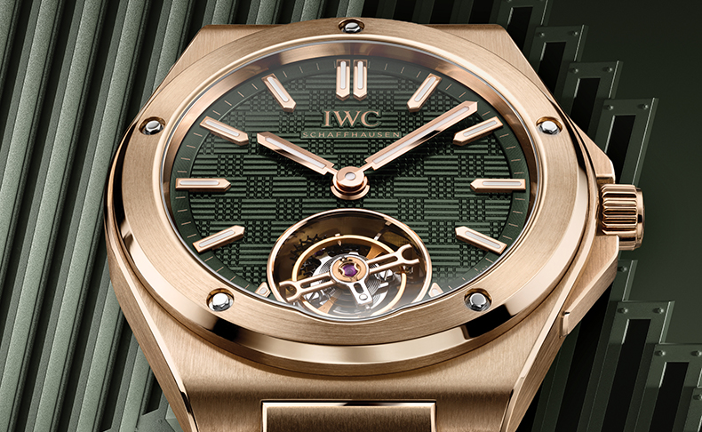 100本限定生産の「インヂュニア・トゥールビヨン 41」(Ref.IW345901)は、18Kレッドゴールド製の41.6mmのケースと一体型ブレスレットを備えています。個性的なベゼル、リューズガード、そしてリューズも同じ貴金属が用いられています。ベゼルをケースリングに固定する機能的なネジは、従来のゴールド合金よりもはるかに硬度の高い素材である18 ct Armor Gold®製です。インヂュニアの特徴的な「グリッド」パターンが施された独特な構造の文字盤が、魅力的な質感と深みをもたらし、そのダークオリーブグリーンの色合いがゴールドと美しいコントラストを織り成します。針にはゴールドメッキが施され、手作業でひとつひとつ取り付けられるアプライド・インデックスはゴールド製です。さまざまな技術を融合させた「インヂュニア トゥールビヨン 41」は、外観上の仕上げにも非常にこだわっています。ケース、ベゼル、ブレスレットのリンクはサテン仕上げで、エッジはポリッシュ仕上げ。ゴールドは「インヂュニア」の複雑なラインとアングルを特に際立たせ、ジェラルド・ジェンタにインスピレーションを得たデザインの彫刻的な美しさを強調します。
