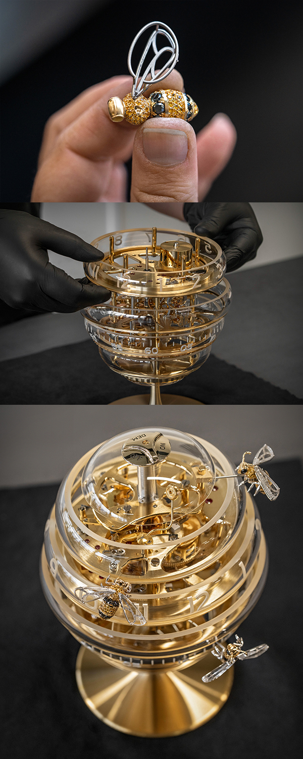 カール‐フリードリッヒ・ショイフレ氏は、このテーブルクロックの製作について、次のように明確に述べています。「フルリエのショパール マニュファクチュールの創設30周年を祝うにあたり、『ザ・ビーハイブ テーブル クロック』は、1996年に再開したムーブメントの自社一貫生産体制にオマージュを捧げるものです。同時にこのクリエイションは、1860年のショパール創業後にルイ‐ユリス・ショパールが採用した初期のメゾンロゴにも由来しており、勤勉、精密、献身を象徴しています。そして何よりも、このクロックは、生態系においてミツバチが果たす重要な役割を思い起こさせてくれるものであります。この素晴らしいオブジェ・ダールの製作に携わってくださったレぺ社、ショパールのハイジュエリー部門、そして情熱あふれるすべての職人たちの実りあるコラボレーションに心から感謝の意を表します」。