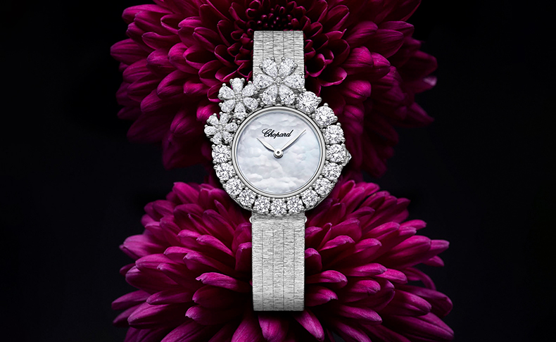 ラウンドケースにマザーオブパール文字盤、そして外周にダイヤモンドのフローラルモチーフをあしらったダイヤモンドセットのベゼルを備えた新作モデルは、同コレクションのジュエリークリエイションの意匠を色濃く反映しています。18Kエシカルホワイトゴールド製のバークタイプブレスレットに施された、人間工学に基づいたシルクのように滑らかなテクスチャーは、極めて希少な専門技術によって生み出されています。そのデザインにはボタニカル(植物的)なインスピレーションが息づいており、ブレスレットに施された極めて繊細な“葉脈状”の模様がゴールドに生命力を与え、1960年代にショイフレ家が完成させた手作業による伝統的な金細工技術によって、比類なき柔らかさと流れるような美しさを実現しています。