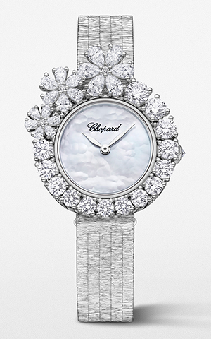仕様:時・分表示、ホワイトマザーオブパール文字盤、フローラルモチーフをかたどったブリリアントカット&ペアシェイプダイヤモンドをセットした18Kエシカルホワイトゴールド製ベゼル、ブリオレットカットダイヤモンドをセットした18Kエシカルホワイトゴールド製リューズ、シースルーケースバック