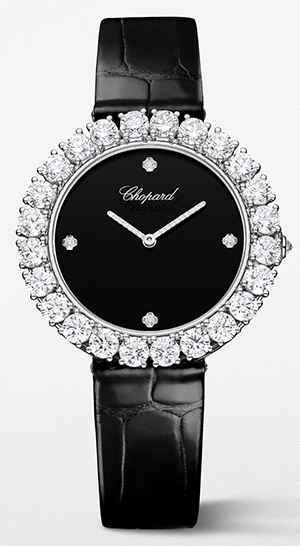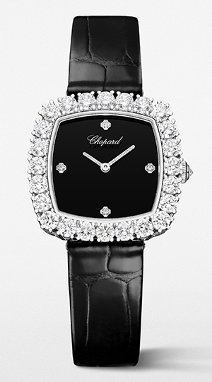 仕様:時・分表示、オニキス文字盤、ブリリアントカットダイヤモンドをセットした12・3・6・9時位置アワーマーカー、ブリリアントカットダイヤモンドをセットした18Kエシカルホワイトゴールド製ベゼル、ブリオレットカットダイヤモンドをセットした18Kエシカルホワイトゴールド製リューズ