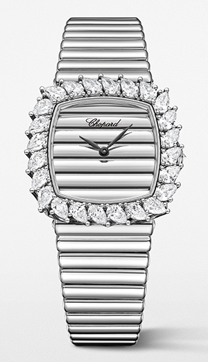 新作コレクションの紹介を締めくくるホワイトゴールド製タイムピースが、「ルール・ドゥ・ディアマン」の物語に新たな解釈をもたらします。コレクションのアイデンティティに忠実に、そのシルエットはペアシェイプダイヤモンドをセットしたベゼルで装飾されています。クッション型ケースには、柔らかな光を放つフルーテッド仕上げ(波形を施した)のホワイトゴールド製文字盤が組み合わされ、その特徴的なテクスチャーは新たにデザインされた一体型のゴールドリンクブレスレットへとシームレスに連なり、統一感のある視覚的な流れを生み出しています。このしなやかなブレスレットのデザインは、1960年代にショイフレ家の工房で生み出された歴史的クリエイションにその起源を遡ることができ、メゾンが長年にわたって培ってきた貴金属細工の熟達した職人技を改めて証明するものです。文字盤にはマットブラックの針が配され、その端正でミニマルなラインがグラフィカルな対比を醸成し、直感的な視認性によって瞬時に時刻を読み取ることができます。先述のオニキスモデルと同じく、自社製の機械式ムーブメント「Chopard 09.01-C」を搭載したこのモデルは、コレクションが放つ輝き、ヘリテージ、そして丹念に研ぎ澄まされた職人技の融合を斬新な手法で表現しています。
