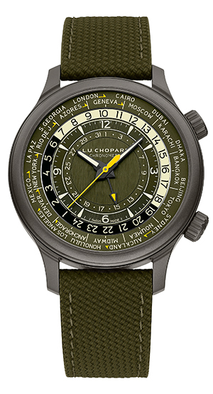 その名の通り、「L.U.C タイム トラベラー ワン」は世界を旅する人のために作られました。ワールドタイム機能により、世界24都市の現在時刻を直感的に読み取ることが可能です。同心円状に配されたディスクで表示される情報は、明瞭かつ洗練された「L.U.C」コレクションの特徴を備えています。2時位置のリューズでローカルタイムを調整し、4時位置のもうひとつのリューズで都市ディスクを回転させ、12時位置でローカルタイムゾーンを合わせると、世界各地の時刻を同時に表示します。カーキカラーの文字盤は、“堅牢なエレガンス”を湛えています。あふれる冒険心やミリタリーヘリテージから着想を得た洗練された色調は、ショパールがこれまでワールドタイマーに採用してきた伝統的なブラック、ブルー、シルバーのカラースキームとは一線を画す、新たな個性を表現します。ベージュのアクセント、バーティカルサテン仕上げ、そしてスーパールミノバ®の蓄光性夜光塗料が視認性を高めています。イエローラッカー仕上げの秒針が大胆なアクセントを添え、カーキグリーンのラバーストラップにブラックのラバーライニング、そして「L.U.C」ロゴが刻印されたセラマイズドチタン製ピンバックルが、このタイムピースを完璧なスタイルへと仕上げます。
