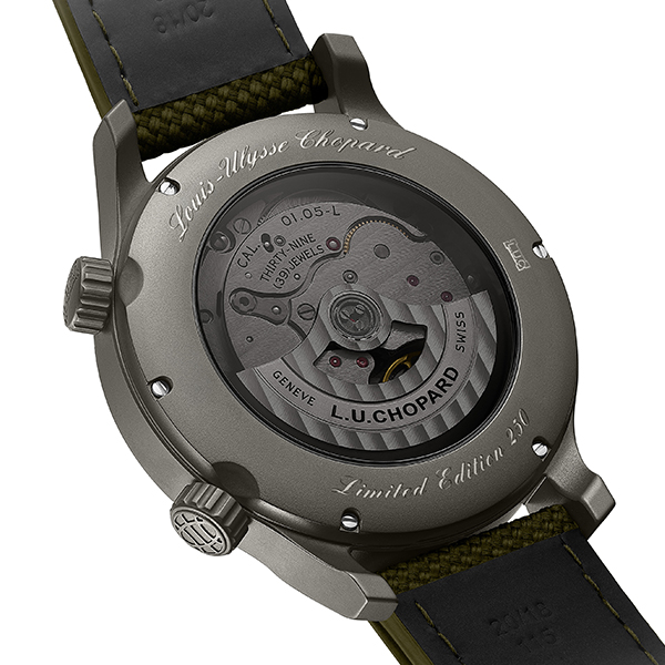 このタイムピースには、自社製キャリバー「L.U.C 01.05-L」が搭載されています。振動数4Hz、約60時間のパワーリザーブを備えたこのムーブメントは、わずかに色付けされたサファイアクリスタルのケースバック越しに、面取りされたブリッジやコート・ド・ジュネーブ装飾など、手作業による精緻な仕上げを堪能することができます。また、秒表示を備える他のすべての「L.U.C」タイムピースと同様に、スイス公認クロノメーター検定局(COSC)によるクロノメーター認定を取得しており、その卓越した精度を証明しています。