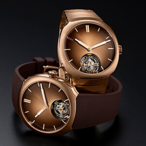 仕様:時・分表示、カーブをつけたサファイアクリスタル、シースルー サファイア ケースバック、「M」で装飾されたサファイア リュウズ、リーフ型針、6時位置にスケルトン ブリッジを備えた交換式ミニッツ・トゥールビヨン