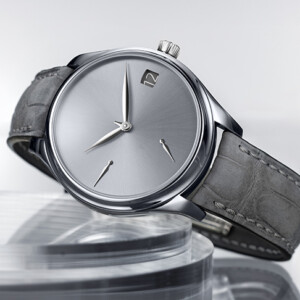 H. モーザーは、ルネッサンス期の画家さながらの巧みな色使いで、ベンチャー トゥールビヨン サファイアのダイアルにふさわしい最もすばらしいサファイアを厳選してセッティングし、そのカラーの違いを巧みに利用して名高いフュメを再現したユニークピースに仕上げました。バゲットカットを施したサファイアのダイアルに拝されたミニッツ・トゥールビヨンは、トゥールビヨン ケースの中にダイブするような印象を与えます。
