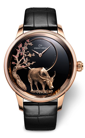 他の2つのモデルには、ジャケ・ドローが大切にするもうひとつの装飾工芸技術を駆使して「レリーフ(浮き彫り)」があしらわれています。この技法は、「レリーフ」の文字通り丑(牛)が文字盤から浮かび上がり、漆黒のブラック オニキスダイアルの前面、レッドルビーの花を咲かせたゴールド製の梅の木の前へと静かに歩いてくるような錯覚を与えています。梅の木は自然と人間、空と大地の調和を象徴しており、ルビーは丑(牛)の大切な価値観でもある勇気と勝利のシンボルとなっています。このインパクトのあるレリーフ画は手作業によるゴールドの彫刻で仕上げられており、レッドゴールドケースとダイヤモンドを施したベゼルとラグを備えたホワイトゴールドケースの2種類の直径41mmのプティ・ウール ミニット(PETITE HEURE MINUTE)の時分表示文字盤の前方にあしらわれています。文字盤と対を成す、アトリエ・オブ・アート(LES ATELIERS D'ART)で彫刻が施されたローターには、オニキスを背景に丑(牛)の頭が表現されています。