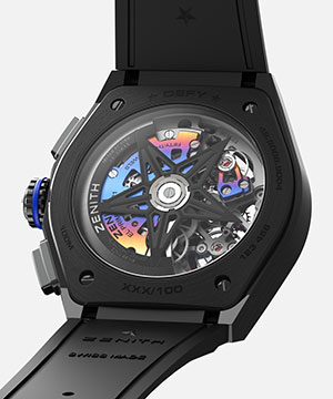 仕様:時・分表示、1/100秒計測のクロノグラフ機能、12時位置にクロノグラフパワーリザーブインジケーター、9時位置にスモールセコンド、中央にクロノグラフ針、3時位置に30分カウンター、6時位置に60分カウンター、「レインボー」PVDコーティング加工のブリッジ、ムーブメント上にブラックレーザー刻印の地板、特別なサテン仕上げのブラックカラーローター、「レインボー」ニスのコーティングを施したアワーマーカーと針、スケルトン加工文字盤