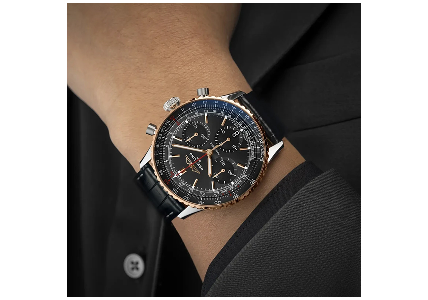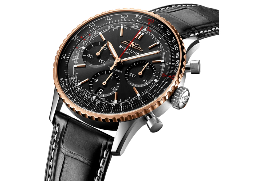 今日のナビタイマーはその最もクラシックな特徴を保ちながらも、現代に即した改良を加えています。平らにした回転計算尺とドーム型サファイアクリスタルで、よりスリムな外観を実現。金属部分にはポリッシュとサテン仕上げを交互に施すことで、光沢を出しつつも控えめな印象に。そして、AOPAの翼が本来の12時位置に戻ったこともその長い歴史の出発点を思い起こさせるアップデートと言えるでしょう。