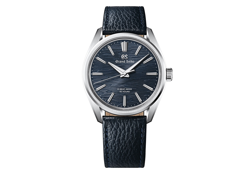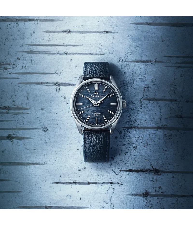 ステンレススチール製のケースは厚さ9.95mmと薄型に仕上げ、すっきりとしたインデックスやベゼル、ラグの幅が、グランドセイコーのドレスウオッチにふさわしい繊細で優美なる存在感を演出。柔らかな感触と美しくシュリンクしたシボの風合いのストラップを採用し、ダイヤルと調和するカラーリングで、月明りに照らされる白樺林の情景を描き出します。