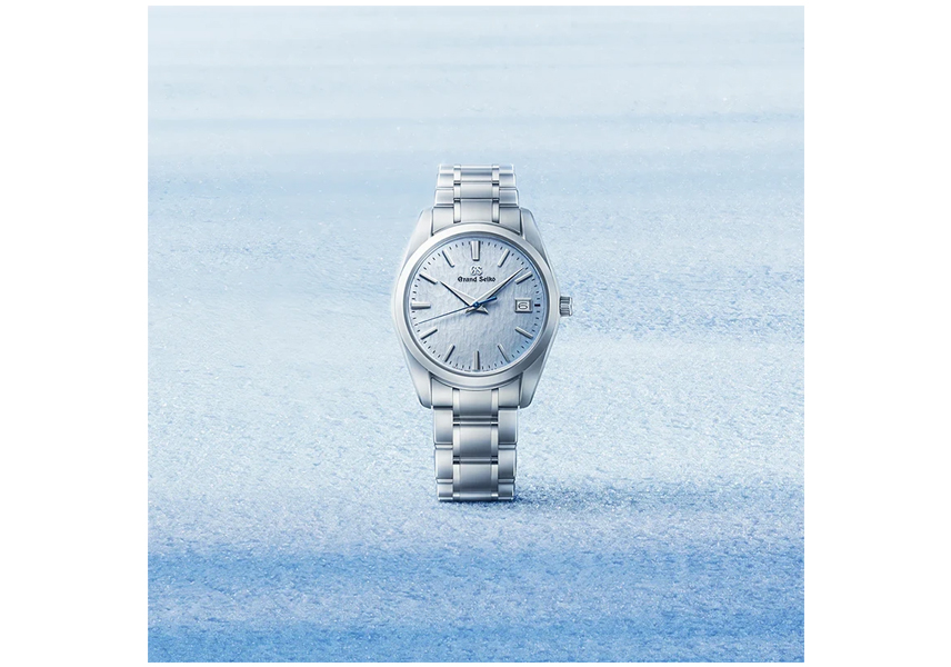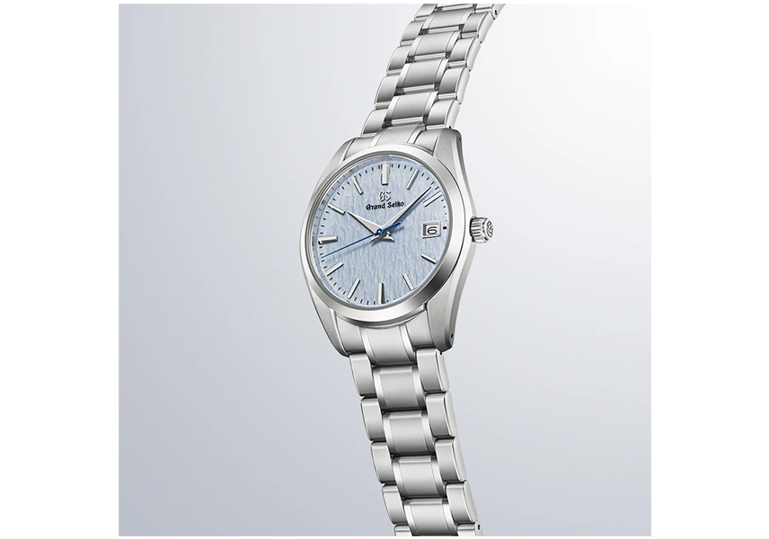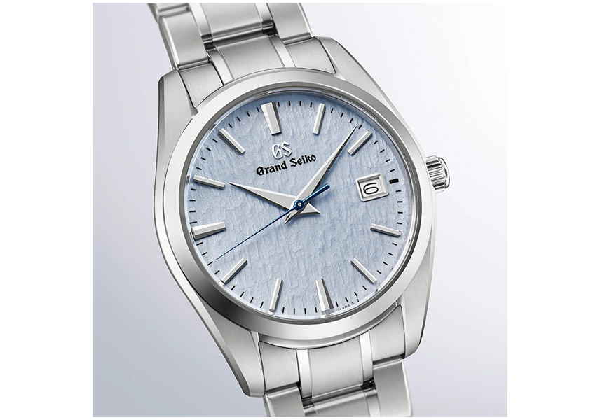 グランドセイコーのクオーツモデルを製造する「信州 時の匠工房」から望む穂高連峰は、冬になると数か月にわたり雪に覆われます。その硬く締まった雪面が強風に削られ、風雪紋が生まれます。この風雪紋を型打ち模様で表現した「雪白パターン」に、雪景色に映る澄んだ冬空の青をイメージしてライトブルーのカラーリングを施しました。そして、ダイヤルの上を流れるように進むブルースチールの秒針が、静かな時の移ろいを表しています。